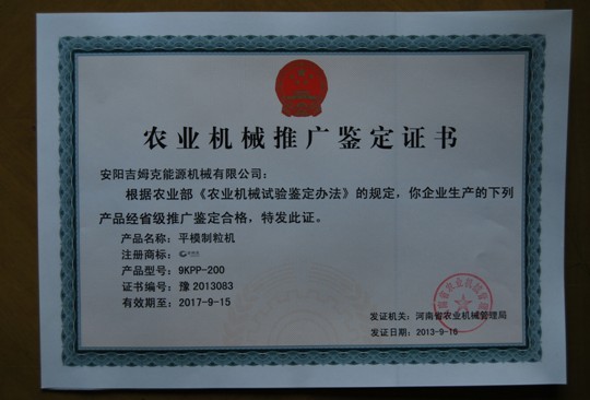 經過全體17c一起官网人的努力,我公司9KPP-90型、9KPP-120型、9KPP-200型(分別為原ZLSP-120、ZLSP-150、ZLSP-200)3個型(xíng)號製粒機通過河南(nán)省農業機械(xiè)管理局審核評定,獲得省級推廣(guǎng)鑒定資(zī)格,並列入《2012—2014年河南(nán)省支持推廣的農業機械產品目錄》(2014調整稿),並於2014年1月(yuè)8日在河南農(nóng)機網上進行了公示。